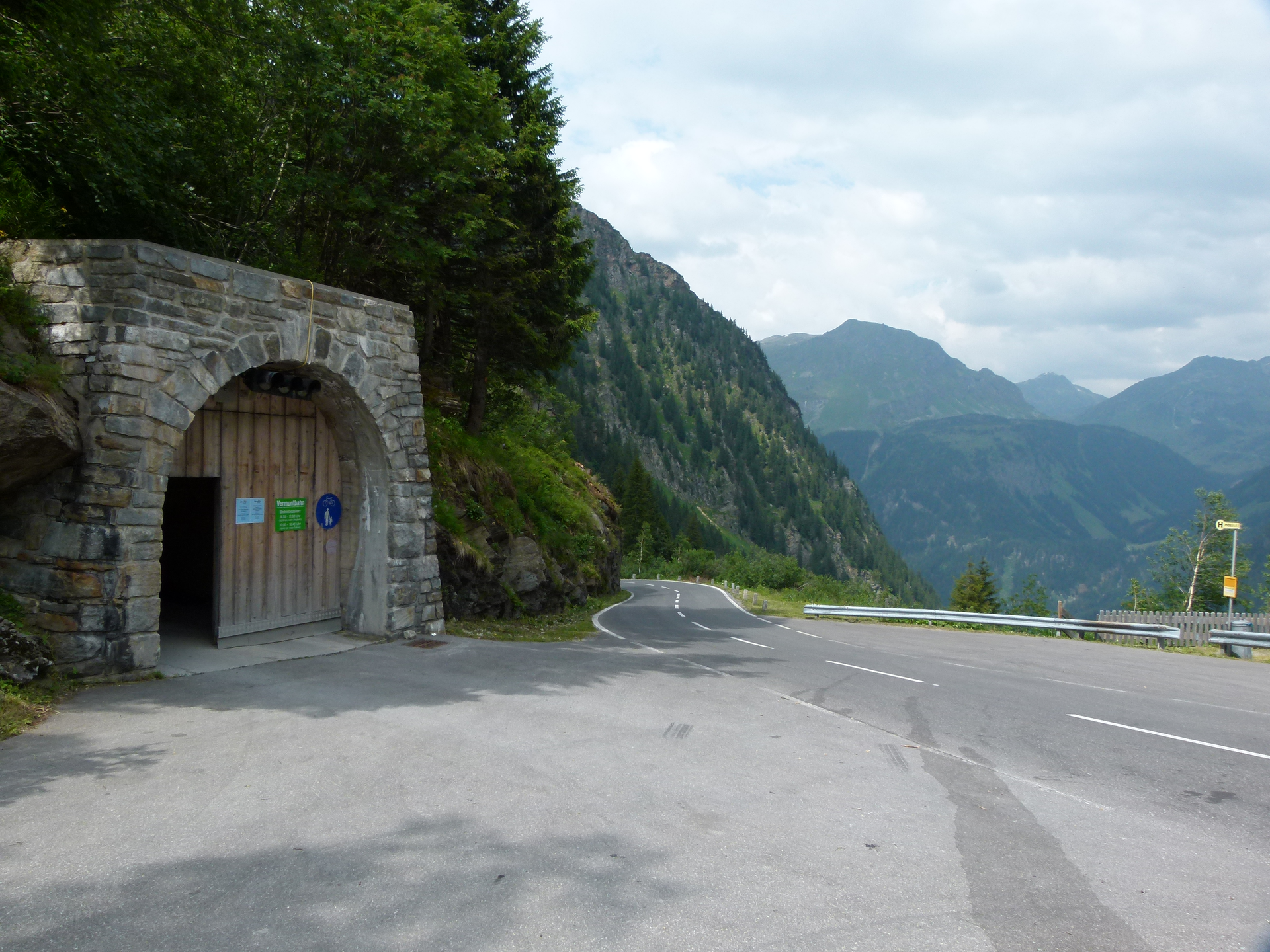 Auf der Strecke mit dem gut einen Kilometer langen Hauptstollen und den vier kleineren Stollen konnten die Arbeiter zuweilen einen Blick auf die grandiose, aber auch gefahrvolle Gebirgslandschaft des Montafons erhaschen. Und deutlich zeigt sich heute auch noch beim Ausgang, warum diese Stollenbahn überhaupt nötig geworden war: Auf der gegenüberliegenden Talseite, unter den exponierten Steilhängen der Zaferna (2277 Meter über Meer) sieht man die Silvretta-Hochalpenstrasse, die unterhalb des Stollenausgangs in langen Kehren Richtung Vermunt ansteigt. Lawinensicher war diese einstige Baustrasse von Partenen zur Stausee-Baustelle nicht. Und noch heute wird die Silvretta-Hochalpenstrasse im Winter geschlossen. Vom Stollenausgang aus, sieht man übrigens Richtung Südosten drei markante Silvrettaberge, links die Hintere Lobspitze, in der Mitte der Grosse Litzner, rechts das grosse Seehorn.