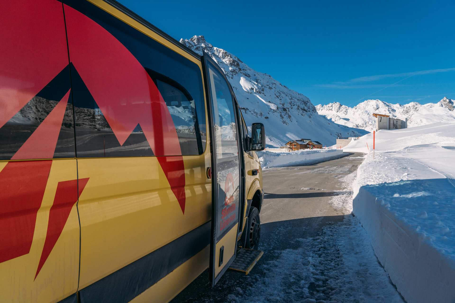 Pünktlich um 08:30 Uhr nehmen wir die Vermuntbahn aus Partenen Richtung Bergstation. Das ist die späteste Bahn, die man nehmen kann, wenn man um 09:30 Uhr am Treffpunkt für die Skisafari sein möchte. Oben angekommen werden die Skier in die Busse verladen und dann steht auch schon das erste Abenteuer des Tages an. Mit dem Bus geht es durch den Tunnel, der im Winter die Bergstation mit dem Vermuntstausee verbindet. Der Tunnel ist so schmal, dass die Busse gerade so hindurch passen. Trotzdem geht es mit hoher Geschwindigkeit durch den Tunnel, dass man die Wände nur so an sich vorbeifliegen sieht. Auf Höhe des Vermuntstausees verlässt man den Tunnel und vor einem eröffnet sich erstmals das atemberaubende Bergpanorama der Silvretta mit seinen beschneiten Gipfeln.