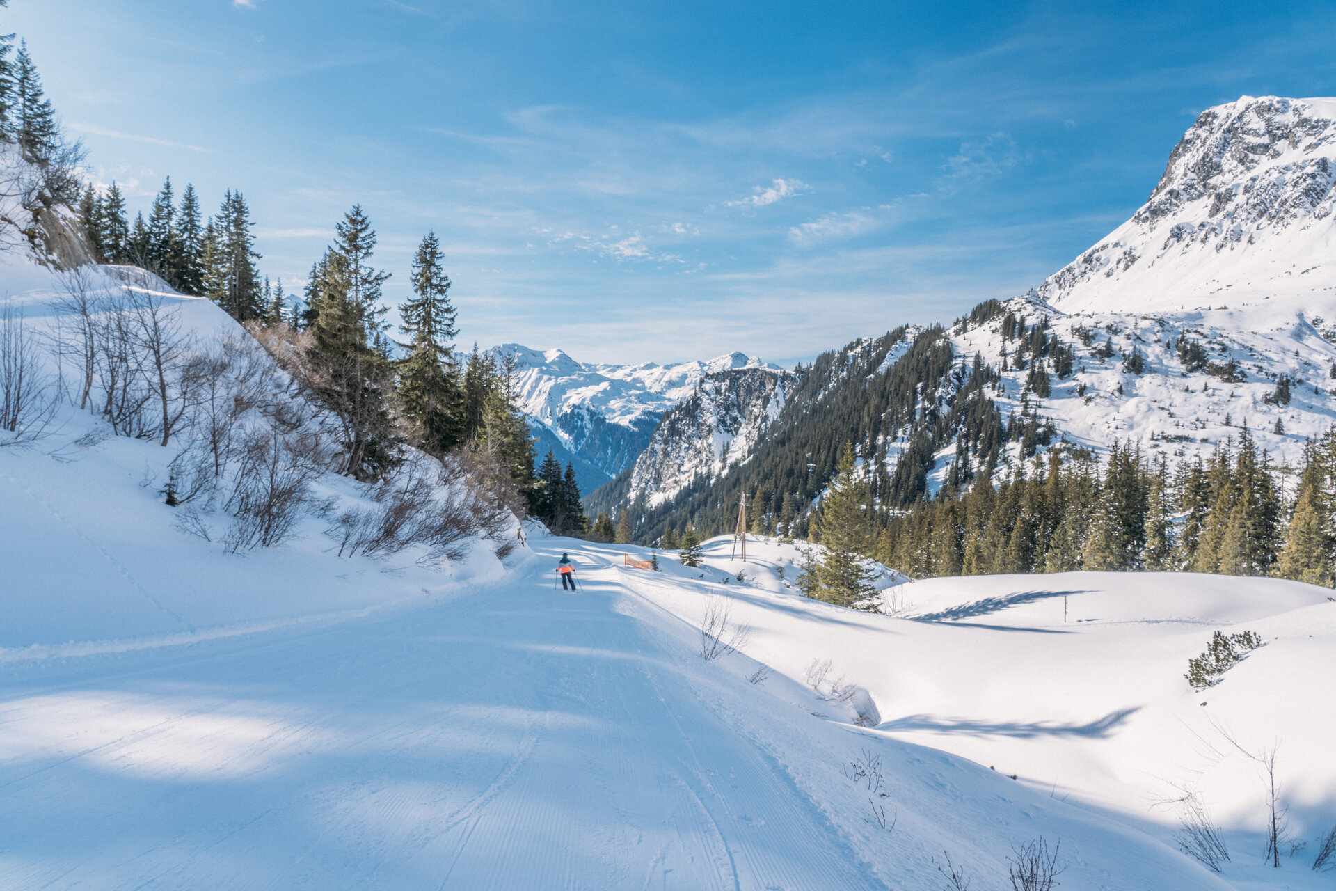 Aber nicht zur Bielerhöhe sondern Richtung Talabfahrt, die einen zurück bis zur Talstation der Vermutbahn bringt. Die Schleppfahrt mit der Pistenraupe dauert ca. zehn Minuten und dann geht es auch schon los mit der Talabfahrt. Die Skiroute bringt uns in schönen Serpentinen durch einen Nadelwald hinunter ins Tal, bevor sie im letzten Teil, dann recht flach wird. Kurz vor Partenen kreuzt man die Silveretta-Hochalpenstraße bevor die wilde Fahrt dann endgültig vorbei ist und wir zurück an der Talstation der Vermuntbahn sind.
